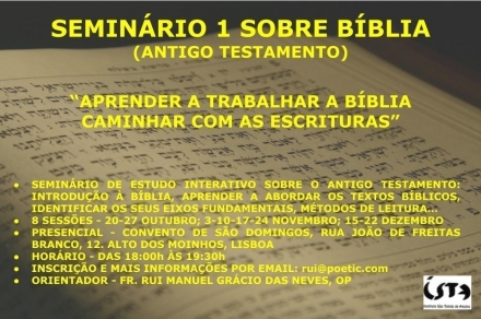 Decorrer no Convento de São Domingos, nos mêses de Outubro a Dezembro/2022, um Seminário sobre a Bíblia (Antigo Testamento) organizado pelo ISTA - Instituto São Tomás de Aquino e apresentado pelo Fr. Rui Manuel Grácio das Neves, OP. PROGRAMA